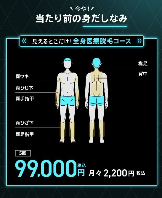 | 見えるとこだけ!全身医療脱毛コース | 5回 | 99,000円 | 2,200円/月 |